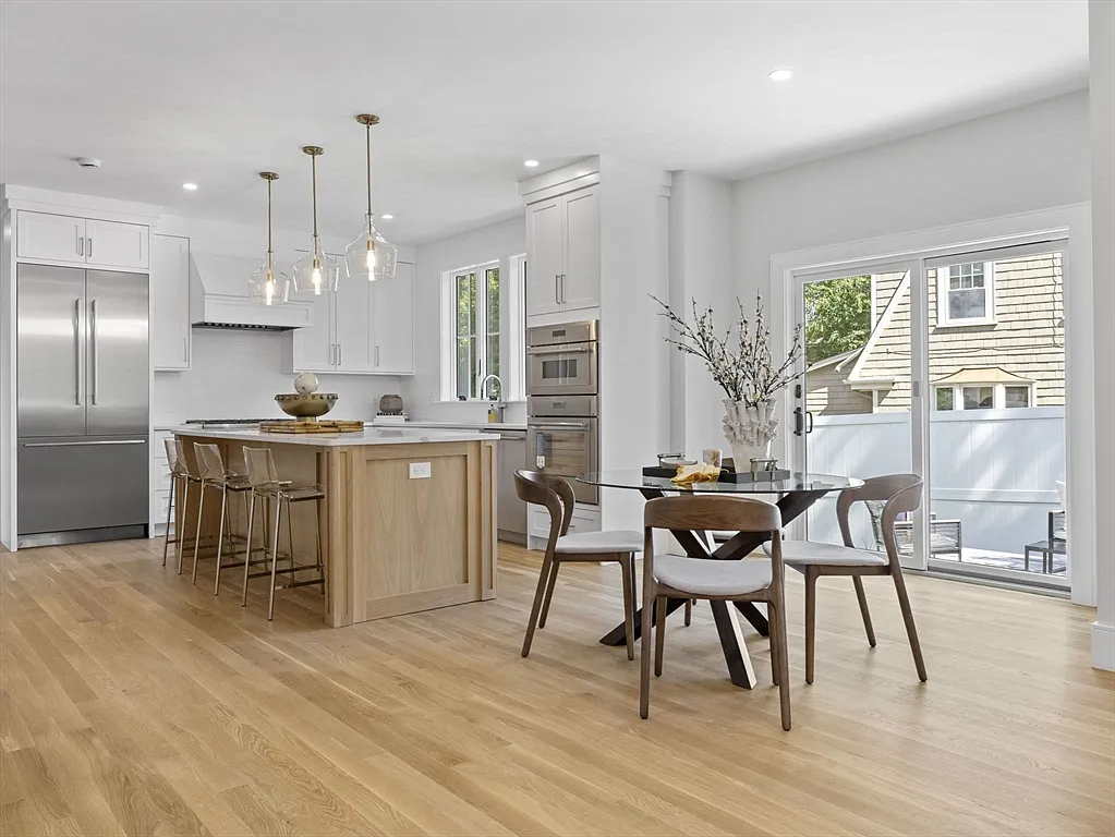 The heart of this home is undoubtedly the state-of-the-art kitchen. It is a culinary enthusiast’s dream, equipped with high-end appliances that promise efficiency and style. The large center island provides ample space for meal preparations and casual dining, while custom cabinetry offers abundant storage solutions. The kitchen’s cozy eat-in area overlooks the meticulously landscaped, fenced backyard, creating an inviting backdrop for morning coffees or evening unwinds.